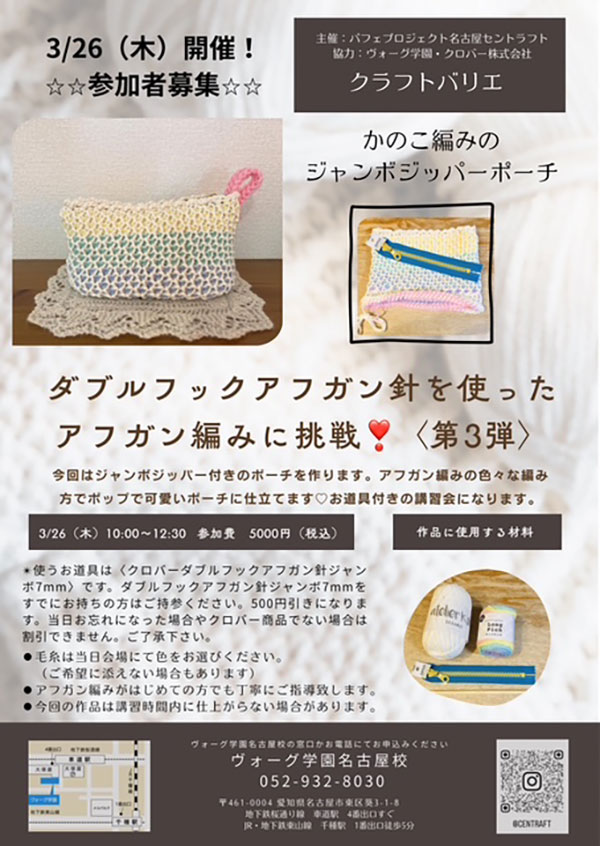 TOP/イベント&ワークショップ/ワークショップ/2026年/3/26 パフェプロジェクト名古屋 セントラフト主催 “「匠」ダブルフックアフガン針を使ったアフガン編み 第3弾!” 参加者募集!(愛知)