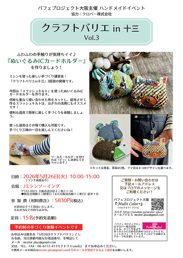 TOP/イベント&ワークショップ/ワークショップ/2026年/5/26 パフェプロジェクト大阪チーム「ミシンを使った楽しい手づくり講習会!クラフトバリエ in 十三」VOL.3 開催!(大阪)