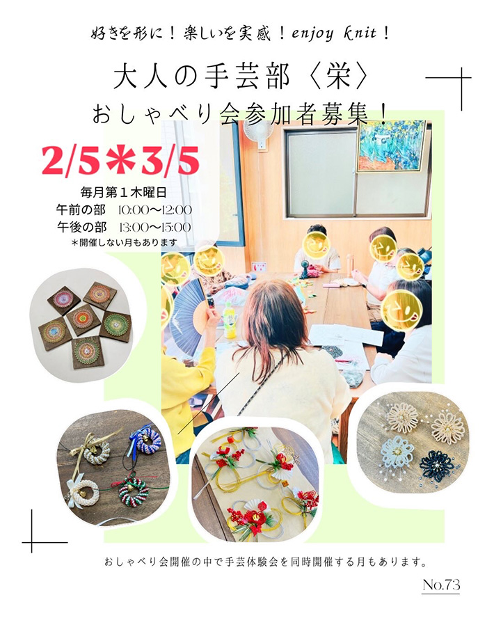 *おしゃべり会開催中に同時に手芸体験会を開催する場合があります。体験会に参加の場合は別途体験会費が必要な場合があります。