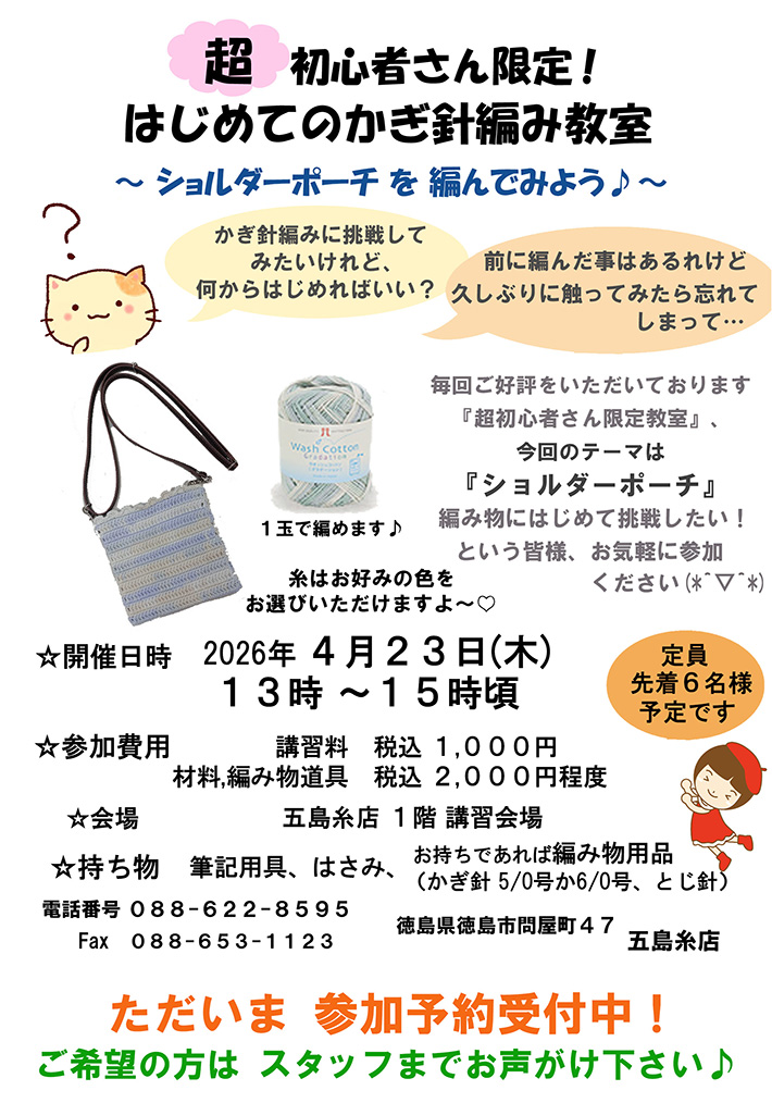 TOP/イベント&ワークショップ/ワークショップ/2026年/4/23 五島糸店「超初心者さん限定 はじめてのかぎ針編み教室 ショルダーポーチを編んでみよう」開催!(徳島)