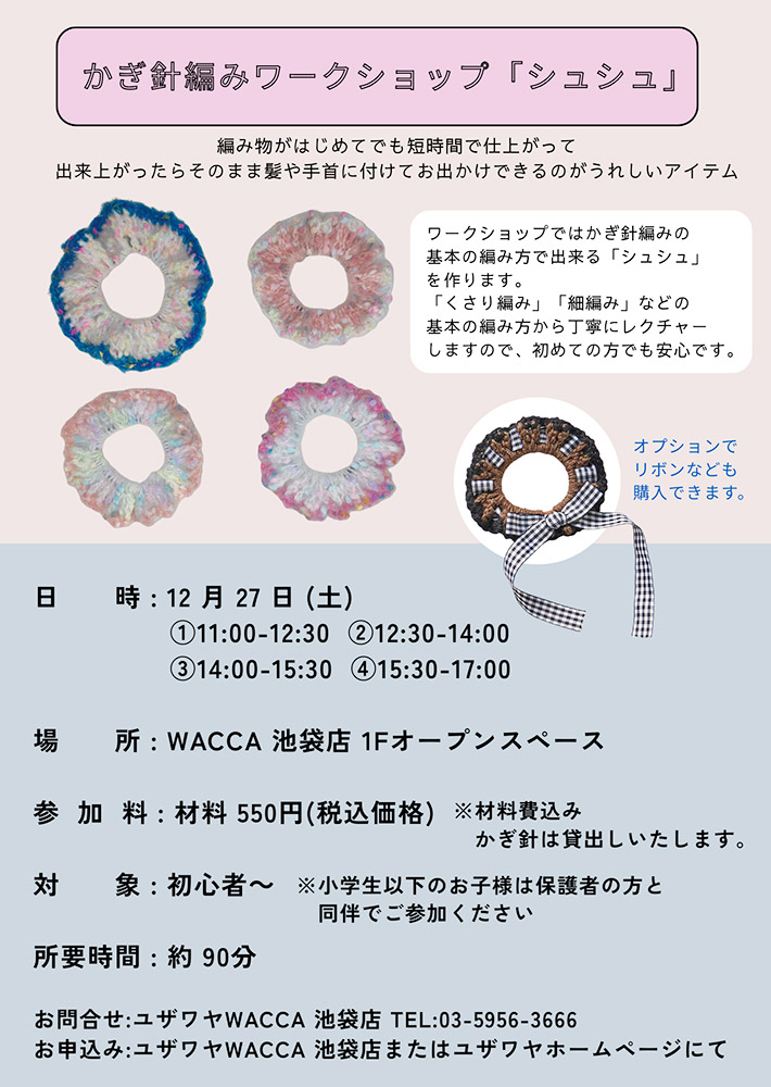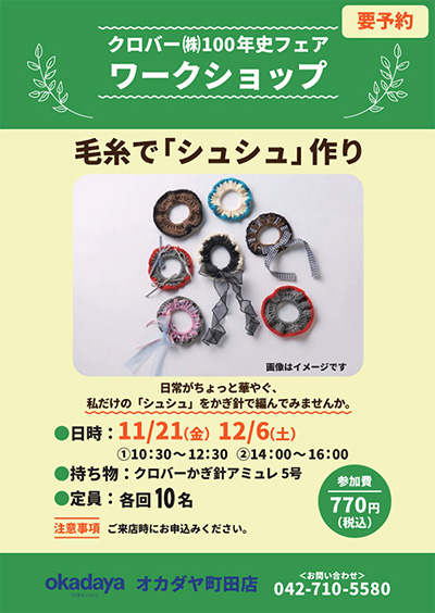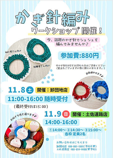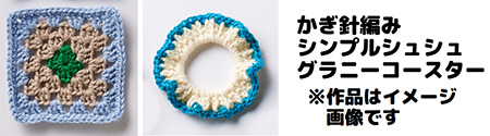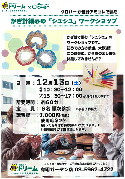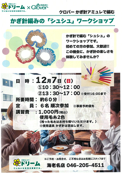 ワークショップでは、かぎ針編みの基本の編み方で出来る「シュシュ」や、「グラニーモチーフ」を作ります(※内容は店舗によって異なります)。