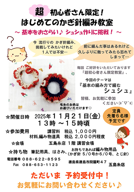 ●持ち物:筆記道具、はさみ、かぎ針5/0号 or 6/0号、とじ針