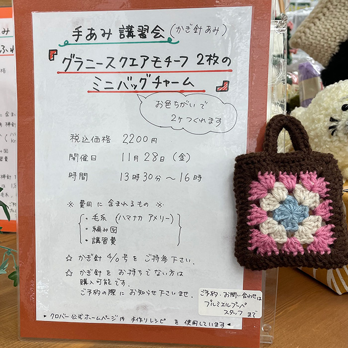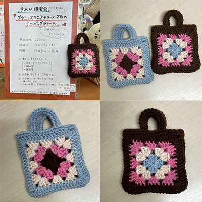 ●参加費:「シュシュ」500円・グラニーモチーフのミニ巾着 1,300円、ミニバッグ2,500円、タワシ800円