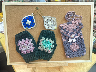 ●作品:毛糸で「シュシュ」・グラニーモチーフのミニ巾着、ミニバッグ、タワシ