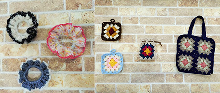 ●作品:A.かぎ針編みのシュシュ B.グラニーコースター