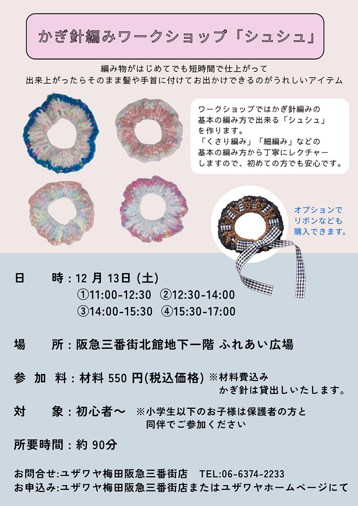 TOP/イベント&ワークショップ/ワークショップ/2025年/全国の手芸店で「かぎ針編み初心者さん向けワークショップ(シュシュ・グラニーモチーフetc.)」を開催します!(関西)