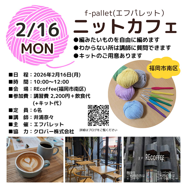 TOP/イベント&ワークショップ/ワークショップ/2026年/2/16 f-pallet主催 【ニットカフェ】in RE coffee(リ・コーヒー)のお知らせ(福岡)