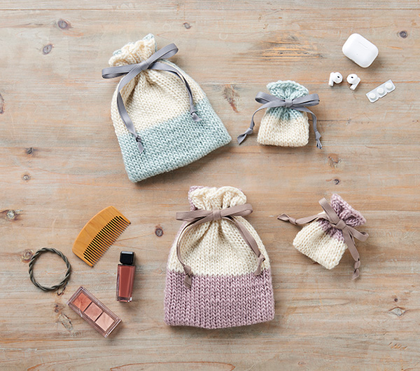 講習会で使われる“「匠」ミニ棒針で編むリボン巾着キット”には、ミニサイズとラージサイズのリボン巾着が1個ずつ作れる材料が入っています。