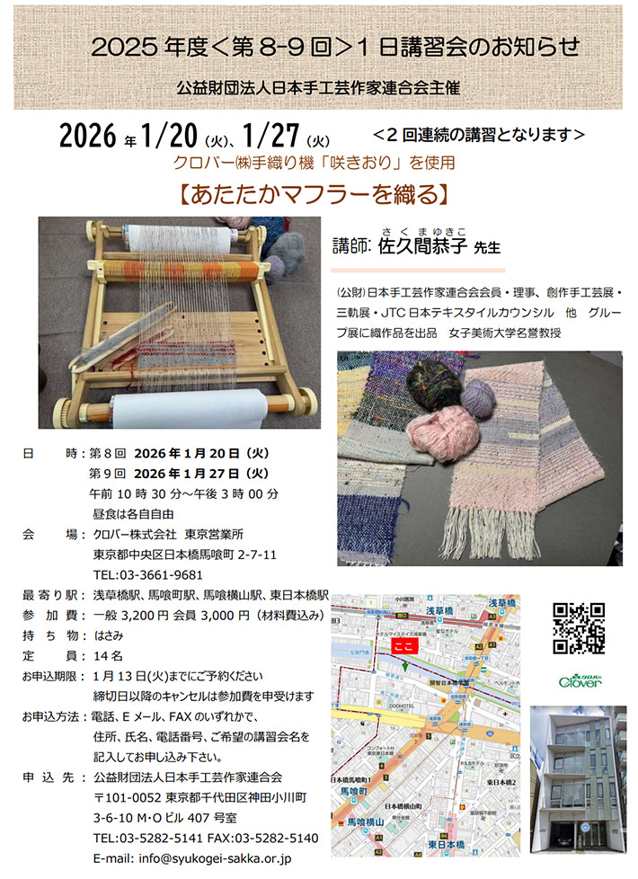 2026年1月20日(火)と27日(火)に、クロバー株式会社 東京営業所で、公益財団法人日本手工芸作家連合会主催「咲きおり」講習会が開催されます。