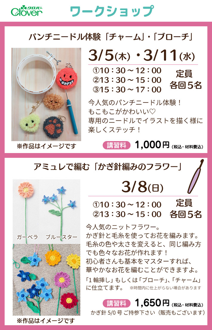 | 日時 | 〔ニットマルシェ開催〕2026年3月5日(木)~11日(水) 営業時間 10:00~ 21:00(スタッフは18:00頃までいます、それ以降お買い物は可能) *ワークショップ開催日 ○パンチニードル体験「チャーム」・「ブローチ」 2026年3月5日(木)・3月11日(水)各日①10:30~12:00 ②13:30~15:00 ③15:30~17:00 ○かぎ針アミュレで編む“かぎ針編みのフラワー”「ガーベラ」「ブルースター」(1輪挿しもしくはブローチ、チャーム) 2026年3月8日(日)①10:30~12:00 ②13:30~15:00 |