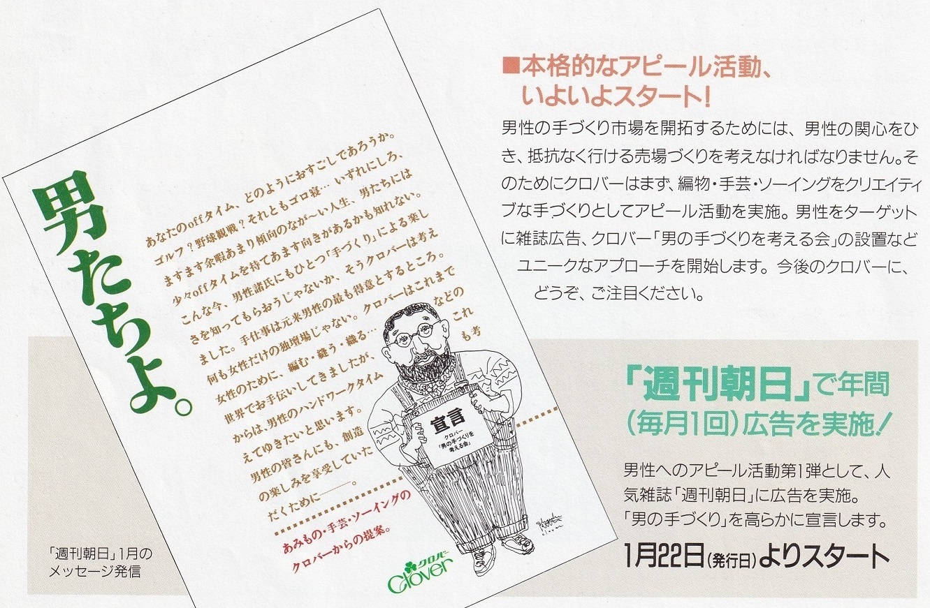 クロバー「男の手づくりを考える会」設立。雑誌「週刊朝日」の広告で「男の手づくり」を宣言、「男の手づくりアイデア募集」を告知する。