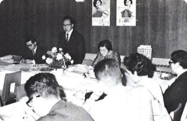 向かって前列右端 創業者岡田敏雄・後列右端 藤田朋美専務取締役(当時)