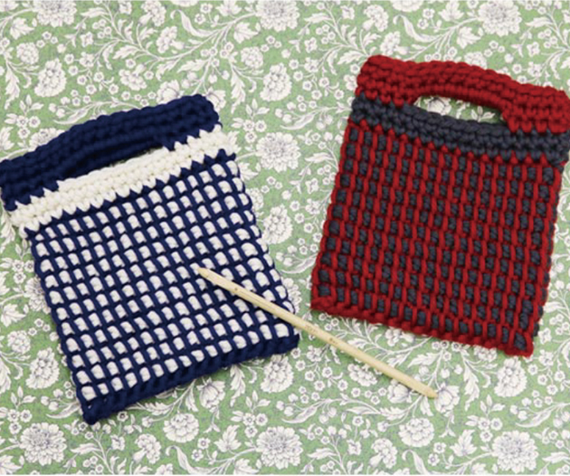 2本の糸で織物のような編み地が楽しめる「匠」ダブルフックアフガン針。編み地が詰まって厚手なのでポーチやバッグにおすすめ。大切なものを優しく包み、入れたものがこぼれる心配もありません。小物もニットであたたかく!