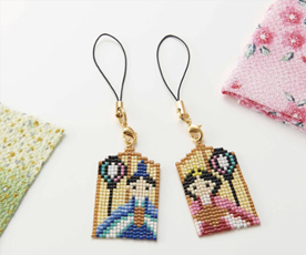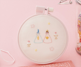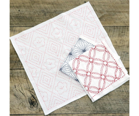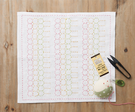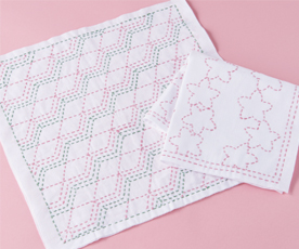 今年のひなまつりは日曜日です。ちらし寿司やひなあられを用意してパーティしませんか♪刺し子ふきんでテーブルを彩りましょう。手縫いでちくちく 刺し子ふきんはひな祭りをイメージして桃の花と菱もちをモチーフにした図案、円満や富裕を表す七宝柄、ウニをモチーフにした柄のがんぜ刺しの図案を用意しました。