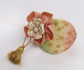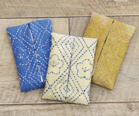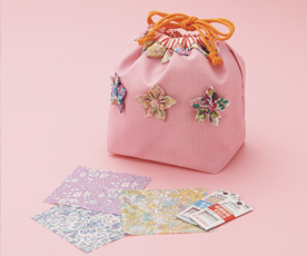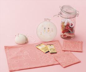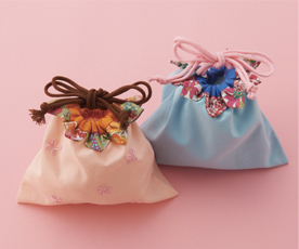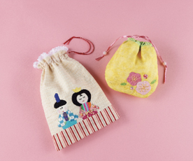 小物でひなまつり気分を味わう手もアリ。ティッシュケースは桃の花と菱餅をモチーフにした刺し子をほどこしました。お弁当袋と巾着はギャザーを寄せるとお花になり、使うたびに楽しい気分に。