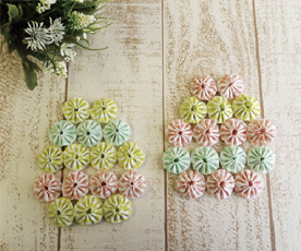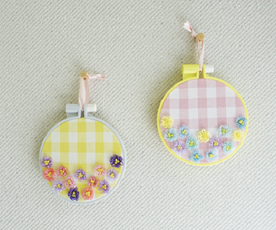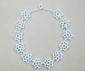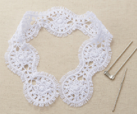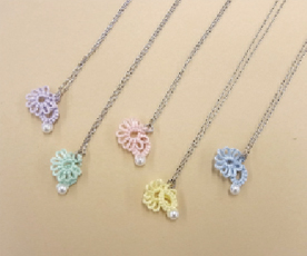 ヘアピンレースは編み器に糸を巻きながら編むだけでレースの幅広い編み地(ブレード)ができます。このブレードをデザインに合わせてつなぐことで、華やかなレース作品が楽しめます♪こちらの3作品がヘアピンレース「ミニ」の作品。
