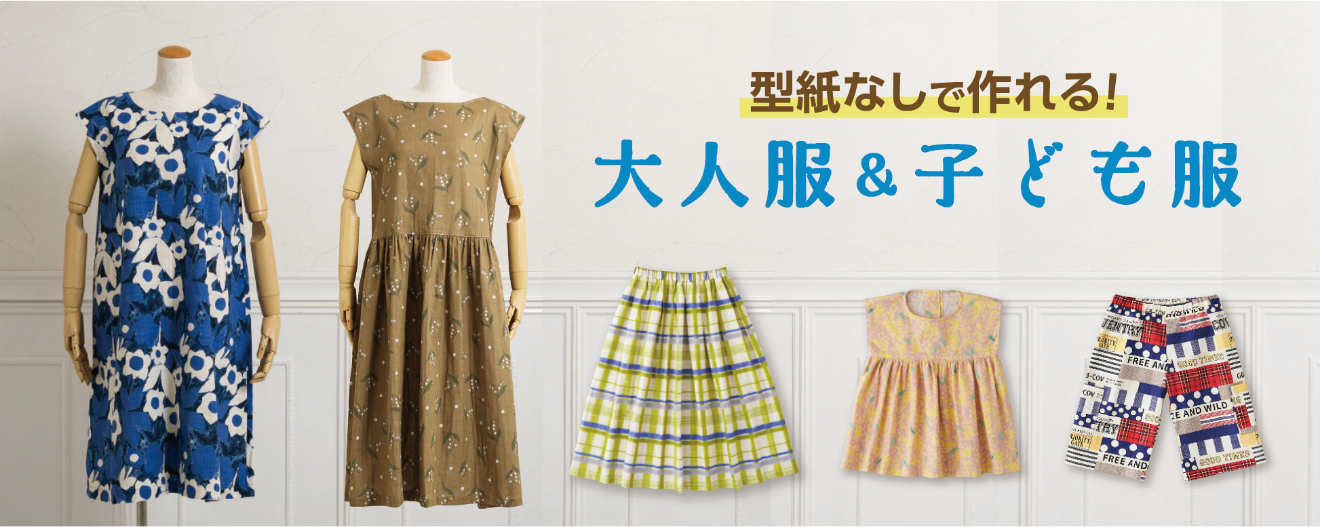 夏ソーイングは裏地がいらないから簡単です。そのうえ「型紙なしで作れる!大人服&子ども服」は型紙もいりません!!お好みの生地を見つけてぱぱっと簡単ソーイングを楽しみましょう♪作品はAラインワンピース(大人)、切替えワンピース(大人)、タックスカート(大人)、タックスカート(大人)、チュニック(子ども)、パンツ(子ども)です。講習会を開催されている手芸店はこちら。