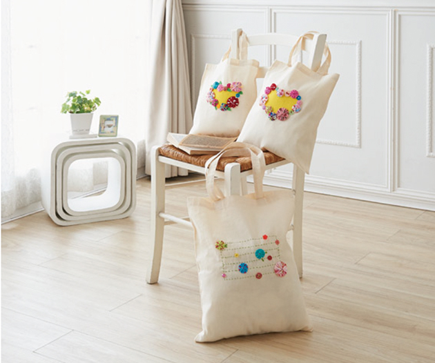 シンプルなバッグにちくちくヨーヨープレートでデコしたバッグも気分がアガる ♡ 布で作ると折りたためて、荷物も重くなりません。1日目、2日目と使うものを分けるのにも便利です。荷物が増えたときに安心です。