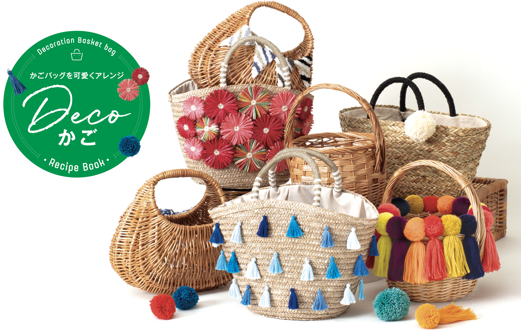 涼しげなかごバッグのアレンジ提案、「Decoカゴ」では、5種の手芸用品を使った12点のレシピを掲載しています!