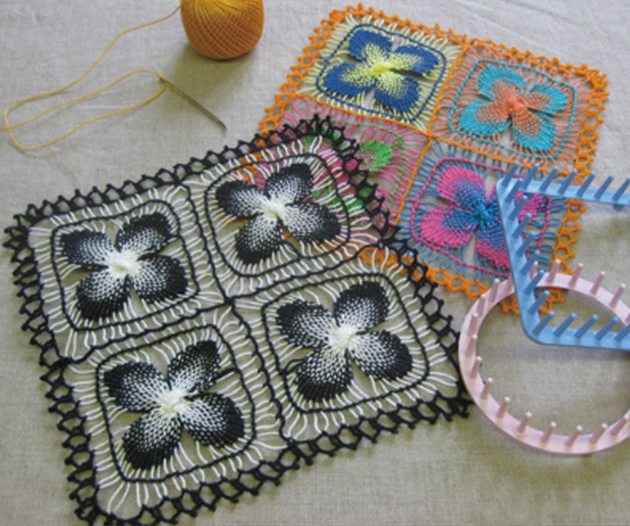 注目度No.1のゴージャスバッグが作れる花あみルーム。6種類の枠が入っています。糸をかけてかがるだけで、いろんなフラワーモチーフが簡単・きれいに作ることができます。テネリフレースやニャンドゥティ風ドイリーなどの小物から、ショールやベストなどの大作まで楽しめます。