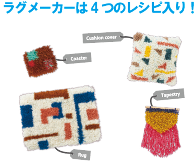 インパクト大のかごバッグが作れるラグメーカー毛糸や好きな糸をカットして、専用フックでメッシュに結びつけていくだけでオリジナルラグが作れます。ラグメーカーにはクッションカバーやタペストリーなど4つの作り方が掲載されたレシピが付いています。色を変えたりアレンジして楽しみ方は無限大です!