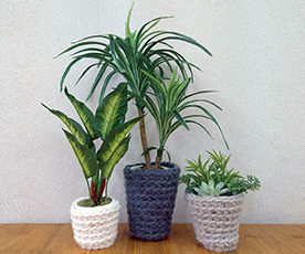お部屋にグリーンを!ジャンボかぎ針「アミュレ」でかぎ針編みのプラントカバー(鉢カバー)を編みませんか。プラントカバーを使うと、グリーンがインテリアに馴染んでおしゃれですよ。植木鉢の高さに合わせてサイズを調整してください。
