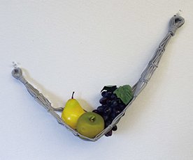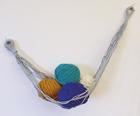 プラントハンガーゲージを使って作るミニハンモック。雑貨小物や野菜、フルーツなど、色々なものを飾って収納できます。おしゃれな上にお部屋がすっきりしますよ♪