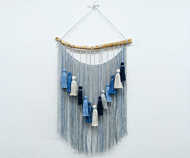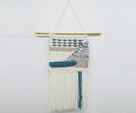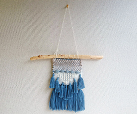 糸や裂き布で織ったタペストリーをお部屋に飾りませんか♪ホワイトやブルー系のカラーでまとめ、さわやかな雰囲気に仕上げましょ。手織り機「咲きおり」、クロバーミニ織り、タッセルメーカーを使って作っています。いろいろアレンジしてくださいね!