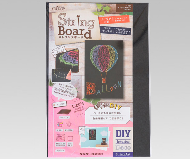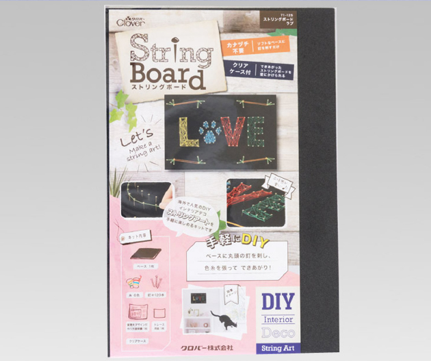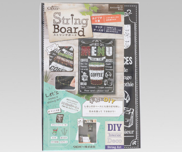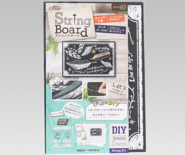 カラフルなストリングボードのインテリアDIYデコ。ソフトなベースに釘を刺して色糸を張るだけの簡単テクニックで、おしゃれなストリングアートが楽しめます。オールインワンキットです。ソフトなフォームベースだから、カナヅチは不要で、指で押すだけで釘が刺せます。デザインがついているのは、プリント入ベースタイプ(カフェ・フェザー)とデザイン付無地ベースタイプ(バルーン・ラブ)の4点です。