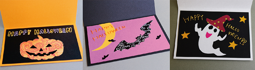 お友達にハロウィンのグリーティングカードを送りませんか?思い出に残るハッピーハロウィンになるはず!パーティの招待状にしても。カーブが多いモチーフもカーブはさみならスムーズにカットできます。柄が左右対称なので、右利き・左利きどちらの方にも持ちやすいですよ。
