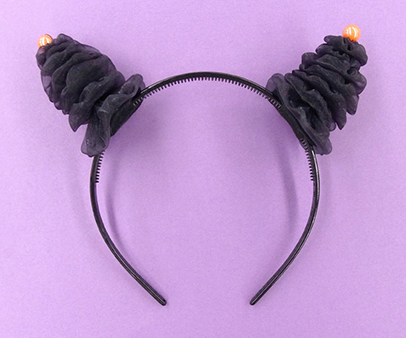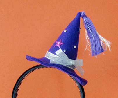 ハロウィンの仮装にも使えるとんがり帽子のカチューシャです。魔女や魔法使いの仮装にぴったり。パープルのとんがり帽子に「タッセルメーカー<ラージ>」で作ったタッセルやビーズ、スパンコールでデコしたおしゃれでハロウィンらしいアクセサリー。帽子の実物大型紙も用意しています!