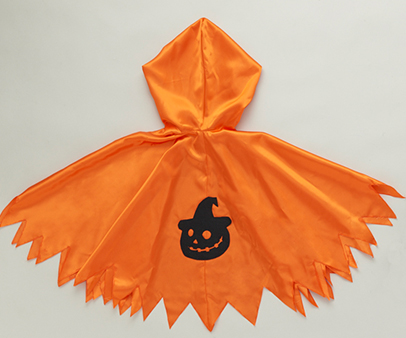 ハロウィンパーティーに、フード付きギザギザマントはいかが?手芸店で売っているサテン生地(オレンジ/112cm幅 160cm)で作りましょう。レシピにはカボチャのお化けの図案もあります。