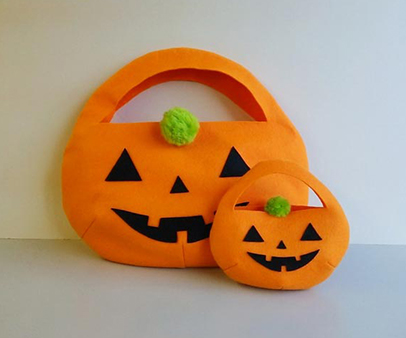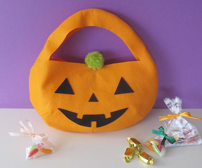 40cm角のフェルト2枚で作るかぼちゃのバッグです。ハロウィンパーティーなどでもらうお菓子がたくさん入りますよ♪20cm角のフェルト2枚で小さいバッグも作れますので、お好みのサイズで作ってくださいね。
