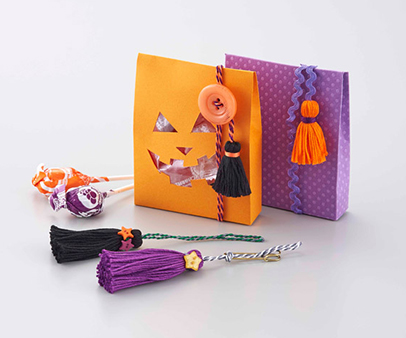 「タッセルメーカー<スモール>」や「タッセルメーカー<ラージ>」、「ハンディヤーンツイスター」がお菓子のラッピングに活躍します!ハロウィンカラーのタッセル飾りとラッピングコードでお菓子を飾りましょう。