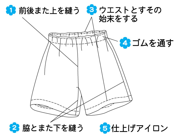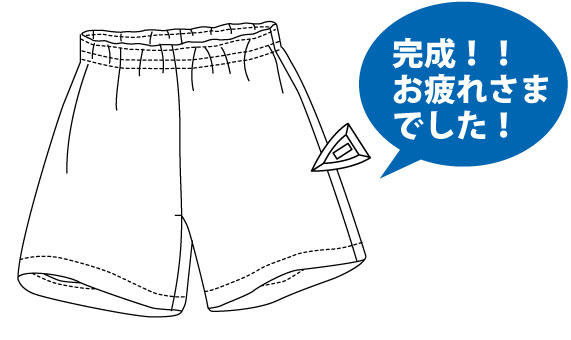 後ろパンツはゴム通し口になるぬいしろは、図のように3cmほど縫わずに残してください。