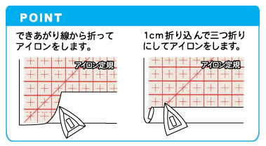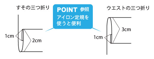 ① 縫う前に、すそとウエストを三つ折りしアイロンをあてておきます。