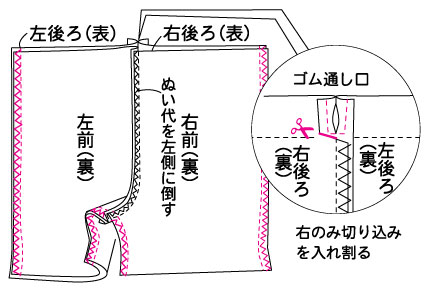 ゴム通し口は右だけ切り込みを入れて割り、コの字に縫います。