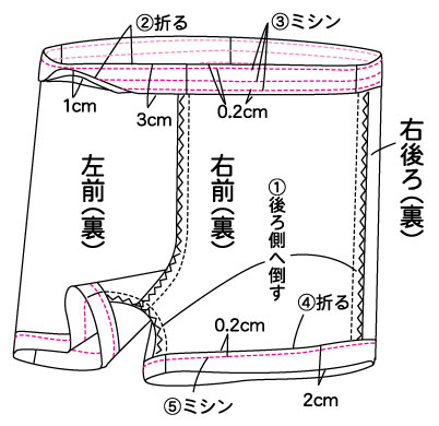 ② 三つ折りした部分をいったん開き、脇とまた下をミシンで縫い、2枚合わせてジグザグミシンをかけます。