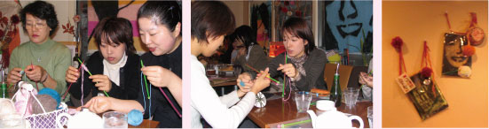 みなさん思い思いのポンポンづくりに夢中! 完成後は、お店で用意された手あみのコースターでのお茶のサービスと超ラブリーなお菓子を堪能しました! |