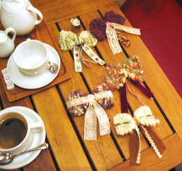 萩原直美さんが用意したリボンブローチのキット。 全て違う色、レースの組み合わせです。 たくさんのキットの中から 皆さんどれにしようかなぁと決めるのが大変そうでした。 |