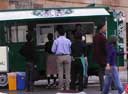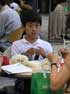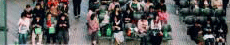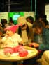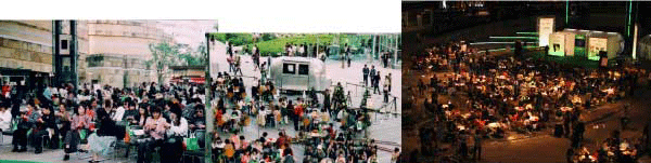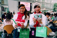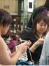 10月15日、お昼12時30分、六本木ヒルズアリーナを巨大ニットカフェに見たてた会場も準備万端、ニットアウトTOKYO2005がスタート!曇り空ながら野外でのんびりするには、ぴったりの暖かいお天気で、開場と同時に多くの方にお集りいただきました。スタッフに作り方のレクチャーを受けると、あとはどんどん編んでいくだけ。合間には、カフェで一服。初日は暖かくて、スターバックスカーはアイスコーヒーが一時品切れになってしまいました。夜になっても人は減らず、ヒルズの綺麗な照明の中でとても楽しそうにあみものをされていました。 |