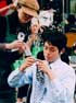 翌16日は生憎の雨模様で、会場を一部縮小してのスタートでしたが、それでも席はずっと満席。午後少ししてから雨が上がり、やっと多くの方にお座りいただける状態に。今日はホットコーヒーがうれしい!この日はTV取材も数件あり、カメラクルーに恥ずかしそうなグループも。あみものを楽しむ方で満員の会場で、クロバーの社長もインタビューを受けました。