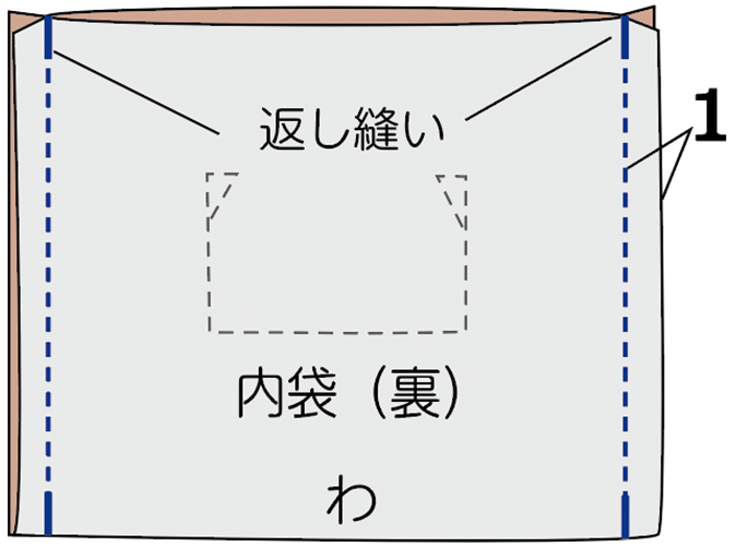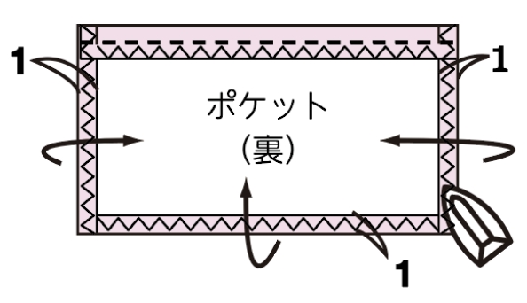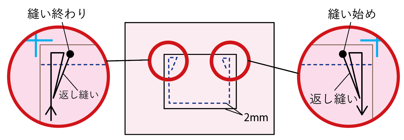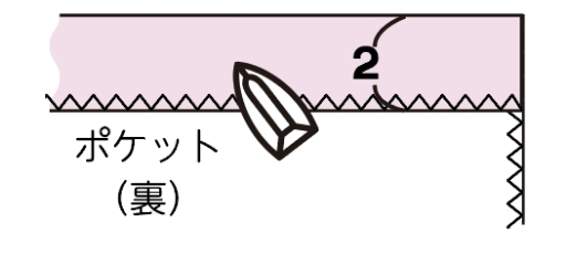 ミシンでポケットを縫い付けるとき、口の端を図のように三角形に返し縫いすると丈夫に仕上がります。
