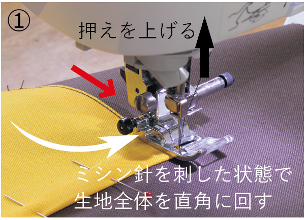 ①ミシンが角にきたら停止し、ミシン針を刺した状態で押えを上げて、生地全体を直角に回します。