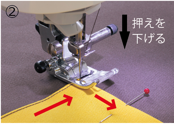 ②押えを下げて続きを縫うときれいな直角に縫えます。