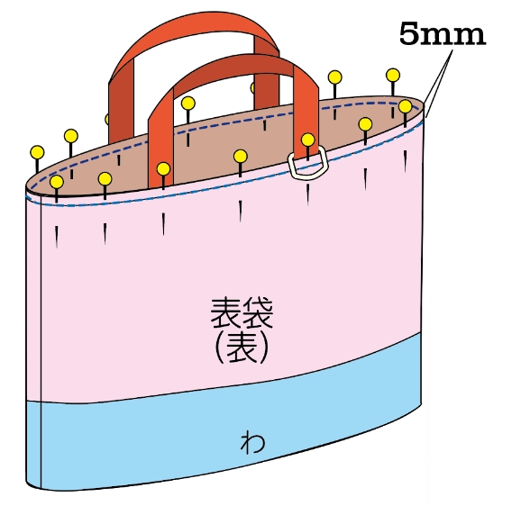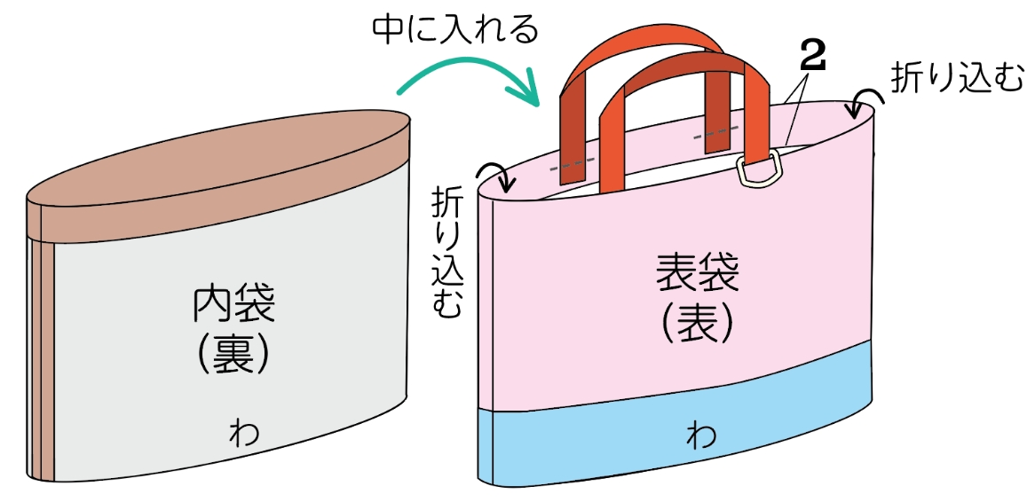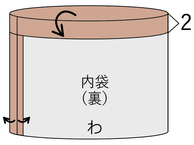 表袋の袋口を内側に2cm折り込み、内袋を中に入れます。