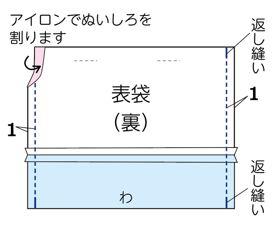 2. 両端のぬいしろを割ってから袋口を折り、アイロンをあてます。