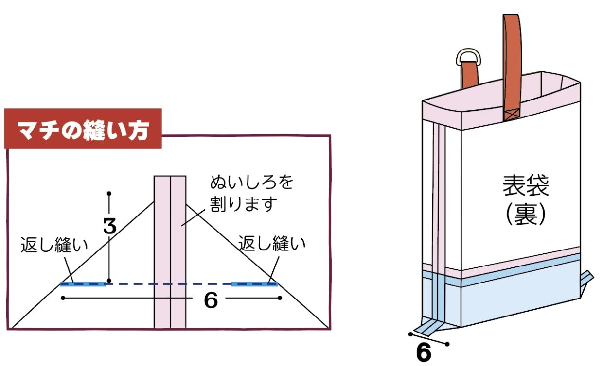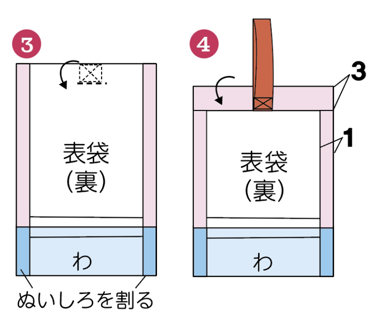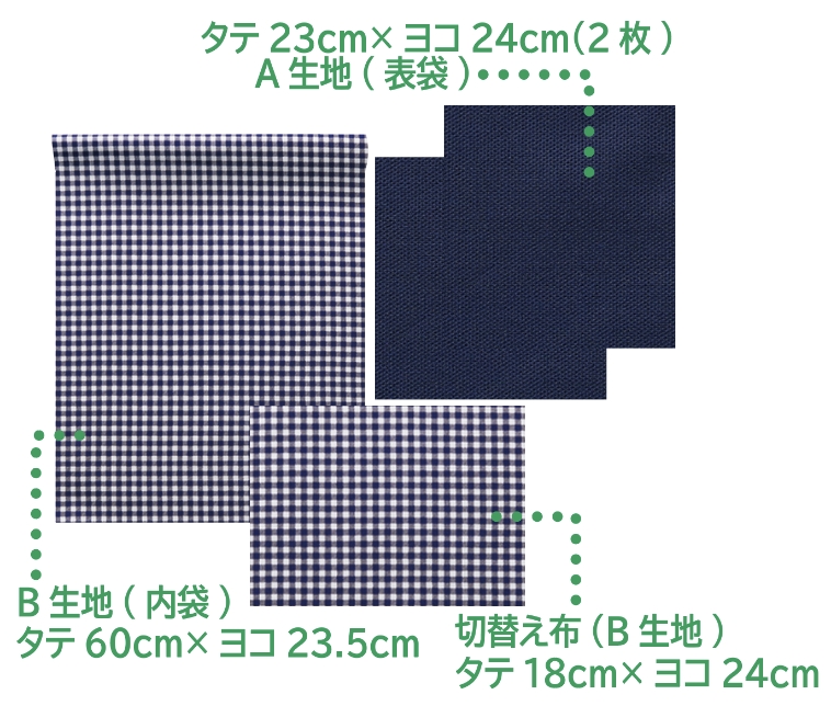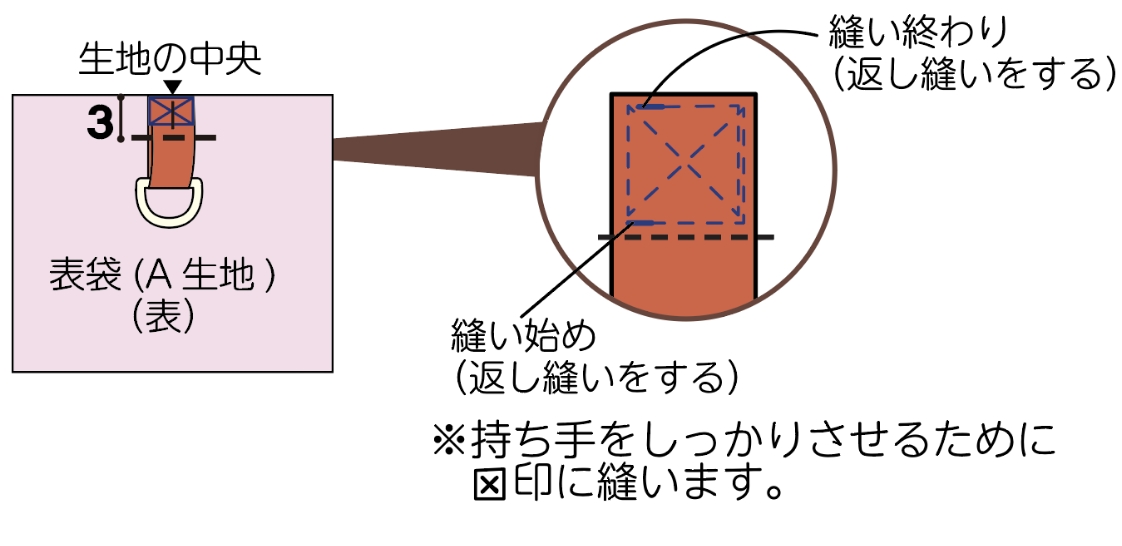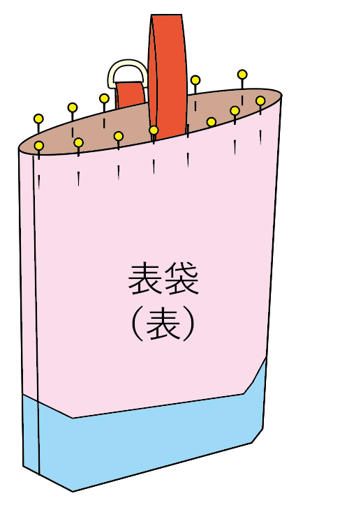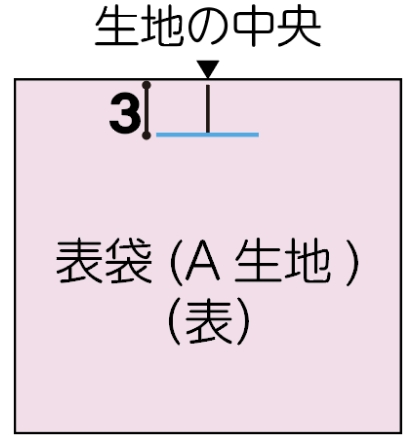 ※表袋(A生地)と切替え布(B生地)の合わせ方は、レッスンバッグ❻参照