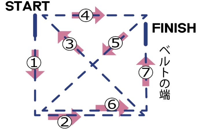 ベルトの端が右側になるようにミシンにセットし、矢印の向きに数字の順番に縫います。