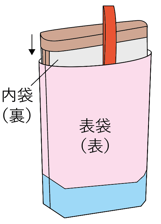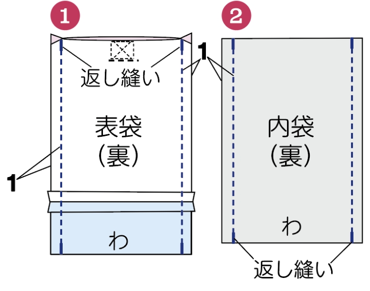 2. 表袋・内袋ともぬいしろを割ってから袋口を折り、アイロンをあてます。